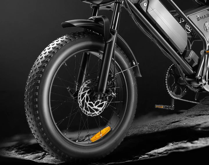 The 20" x 4.0" fat tires are designed for superior traction and stability,allowing for a smooth ride on various terrains, including sand, snow, mudand rocky paths. The wide, rugged tires provide increased comfort byabsorbing shocks and bumps, making them ideal for off-road adventuresand urban commuting alike. With enhanced grip and durability, these tiresensure greater control and confidence in challenging conditions.